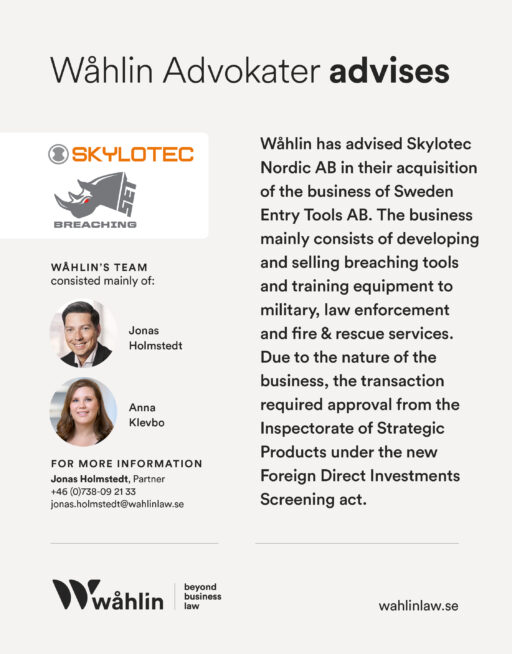 Wåhlin has advised SKYLOTEC NORDIC AB in their acquisition of the business of Sweden Entry Tools AB. The business mainly consists of developing and...