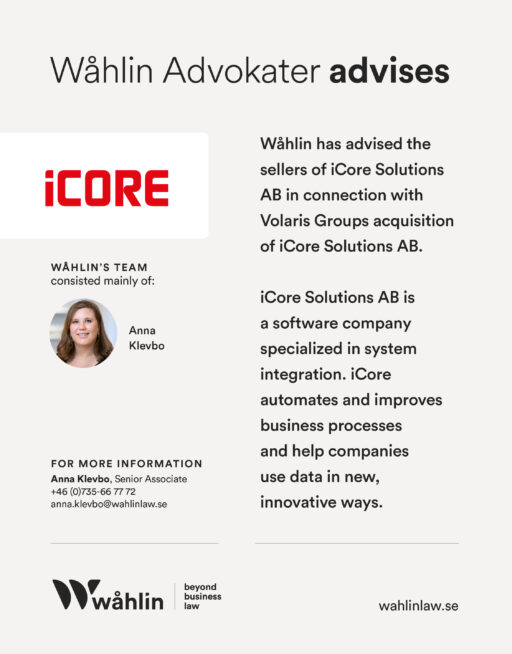 Wåhlin Advokater has advised the sellers of iCore Solutions AB in connection with Volaris Groups acquisition of iCore Solutions AB.