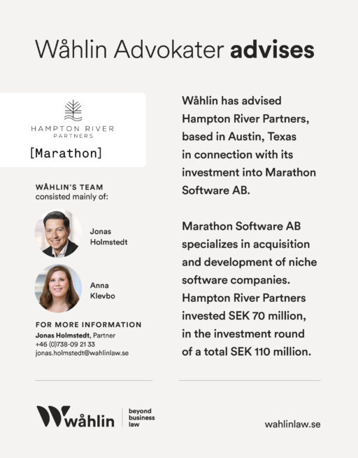 Wåhlin Advokater has advised Hampton River Partners, LLC, based in Austin, Texas in connection with its investment into Marathon Software.