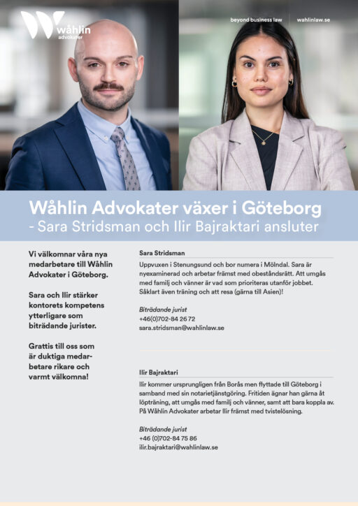 Vi välkomnar våra nya medarbetare till Wåhlin Advokater i Göteborg. Sara Stridsman och Ilir Bajraktari stärker kontorets kompetens ytterligare som biträdande jurister. Varmt välkomna!